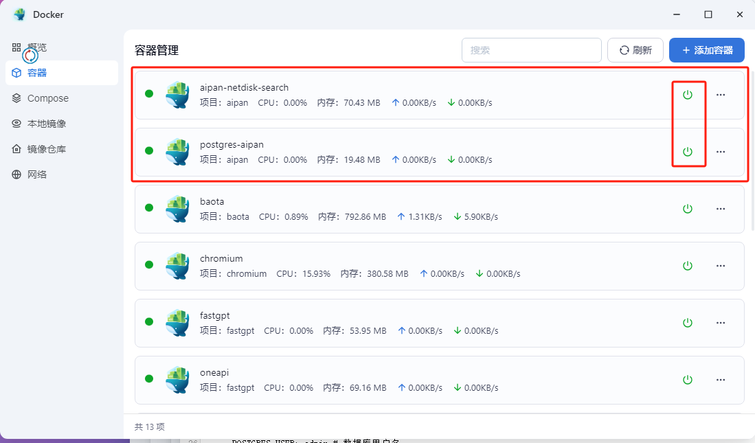 6.点击docker的容器,能看到两个容器已经创建成功,并且没有报错,这样就是安装成功了。