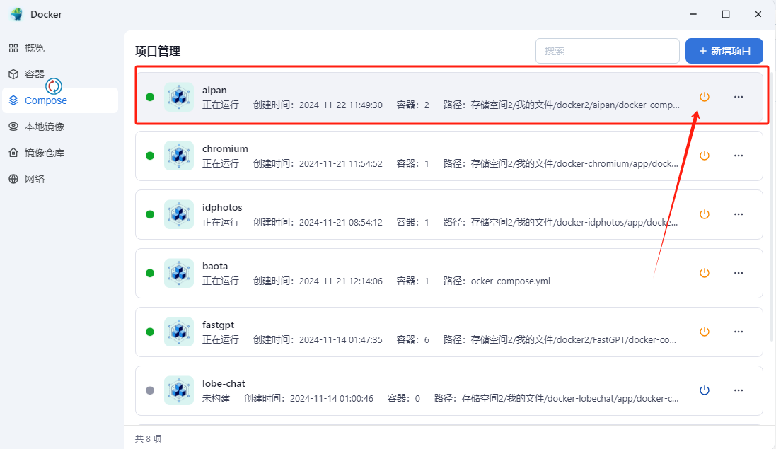 5.点击刚才创建的项目的启动图标,等待创建容器。