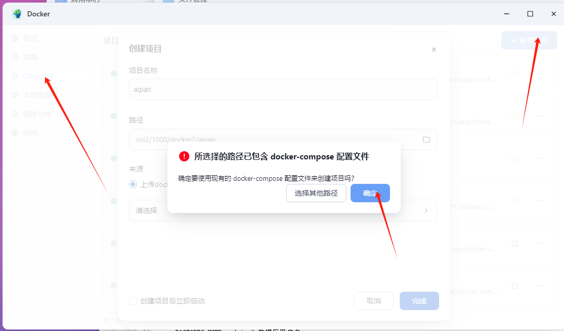 4.打开飞牛的docker面板,compose里创建项目。项目名称自定义,路径选择刚才创建的文件夹,然后弹窗点击确定,再点击完成即可。