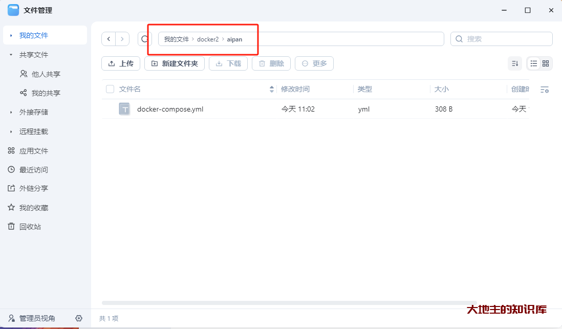 2.电脑上创建一个docker-compose.yml的空白文件,不会创建直接电脑任意地方右键新建txt文档,然后修改名字即可,修改名字的时候记得把后缀也改了,最终的文件名是docker-compose.yml。上传到刚创建的aipan文件夹,如上图所示。