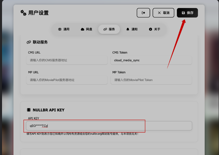 2.粘贴到NULLBR API KEY中,保存