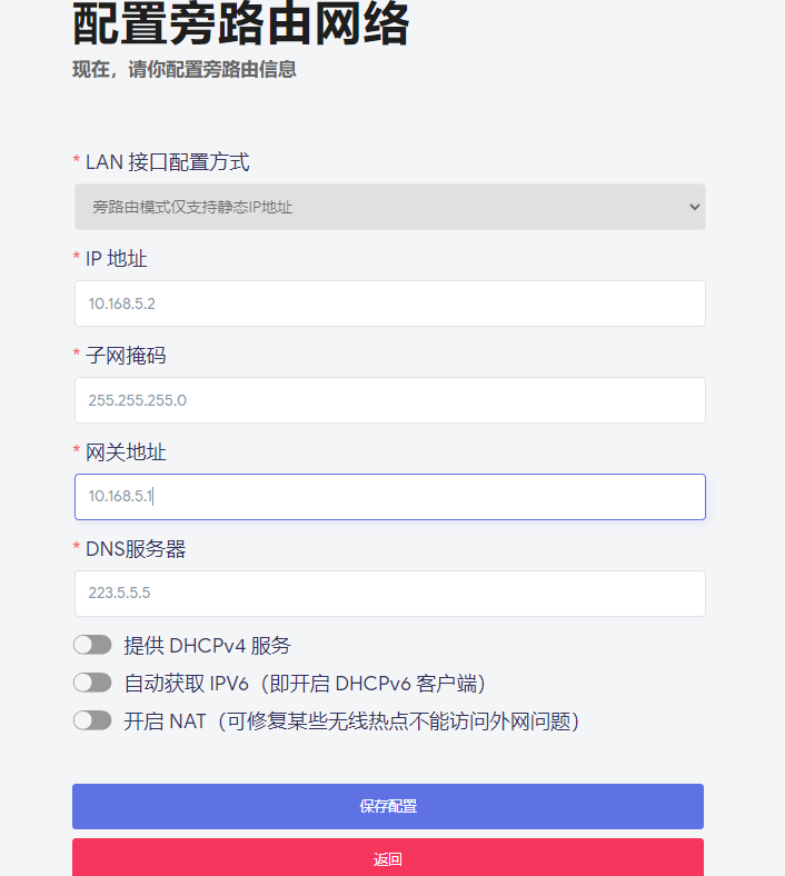 配置软路由网络,这里选择旁路由