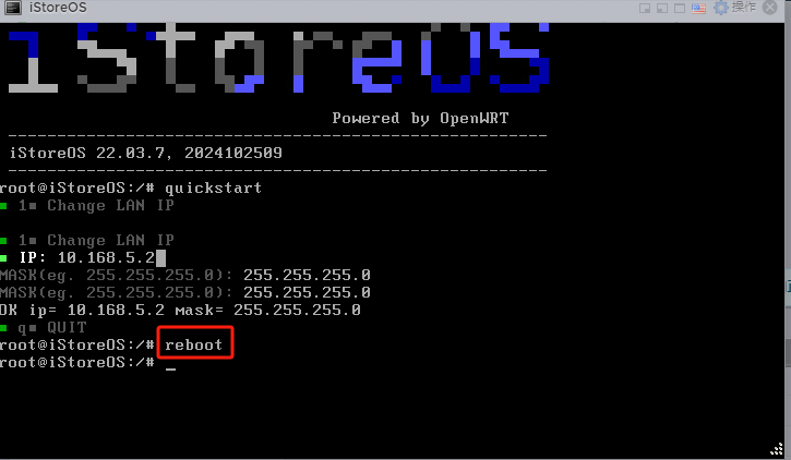 配置好IP地址后选择q ,输入reboot 重启软路由