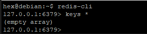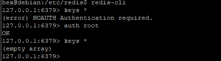 redis> auth root再次查看所有key,有存数据则会显示key,若没存数据则提示:(empty array)